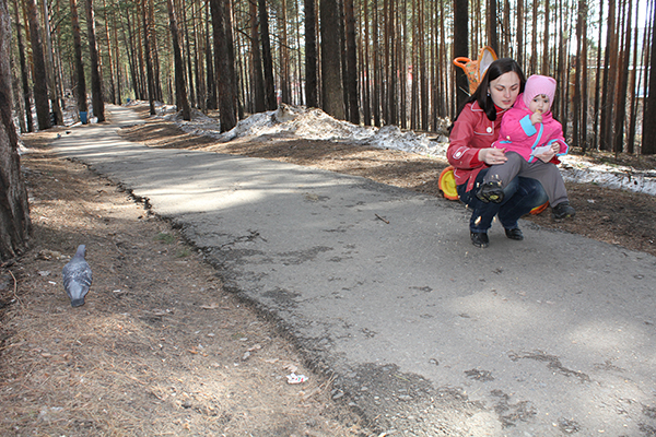 6. Тут по дороге нам попадаются голубки. и наша птичка говорит, что их нужно покормить и тогда прилетит ее подружка. Оказалось, что моя крошка их боится, быстро запрыгнула к маме на руки, а печеньку в зубы.