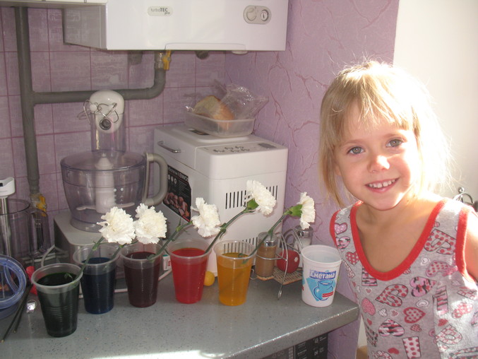 Пришли домой, обрезали гвоздики до нужной нам длины (чтоб в стаканчик хорошо становилась), подождали 2 часа чтоб подсох стержень у двоих (так цветочница посоветовала), а у трех не стали, развели краску и поставили сие чудо.