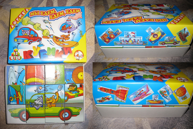 Можно собрать одиннадцать видов транспорта (примеры сборки только сбоку на коробке ) из разного количества кубиков (одновременно два, кроме парохода).