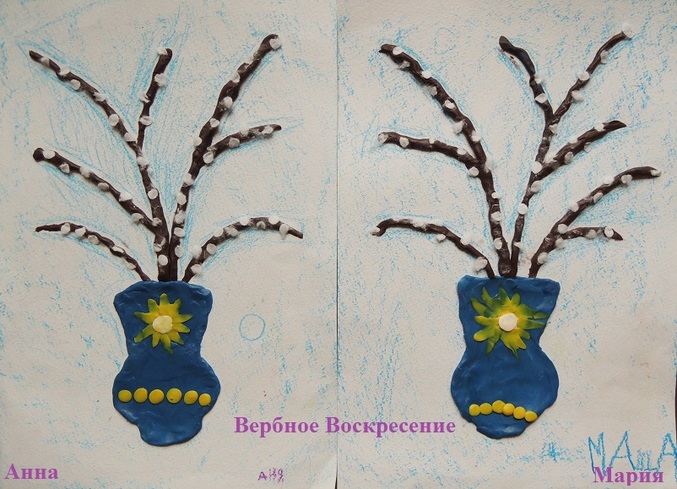 Техника пластилинография мне очень понравилась. Картины получаются объемными. На плотной бумаге мы предварительно сделали легкий фон, потом я нарисовала контуры веток и вазочек. Сами цветы вербочек-это вырезанные дыроколом круглешки из ватных дисков.