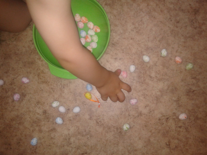 Ну и маленькие яички дети сами разбрасывали, собирали в разные емкости, рассказывали какого они цвета и формы.