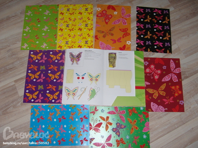 Бабочек рисовала и вырезала сама,а несколько вырезала из вот такого набора, стоит он 85 р, там 10 листов, на каждом листе свой фон и бабочки разной величины. Листы типа мелованый картон.