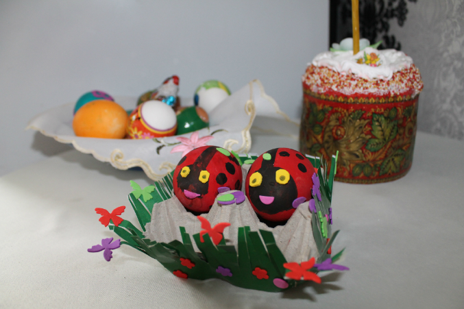 С покраской яиц была отдельная история, Вадим все яйца рвался замаскировать под божих коровок))))))))) удалось убедить его остановиться только на двух))) Но вот от полянки для них отговорить не удалось, пришлось помогать)))))))