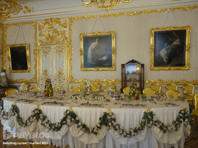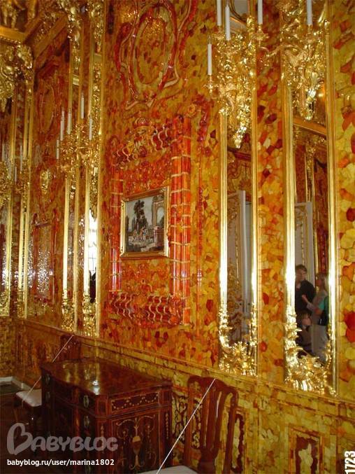 За те годы, что я не была в Пушкине, появились новые отреставрированные комнаты. Одна из них - Янтарная. Еще в детстве я зачитывалась исследованиями известного журналиста и прекрасного советского писателя Юлиана Семенова о его расследовании пропажи Янтарной комнаты.У него, кстати, есть книга о Янтарной комнате, советую очень. Вообще, Юлиан Семенов один из очень немногих сильных советских писателей в сложном жанре политического и военного детектива. Меня давила жаба, что немцы вывезли ее в Кенигсберг и далее, вообще следы ее терялись. Якобы они таким образом вернули себе то, что им принадлежало.. Да, ее подарил прусский король Петру I, так а кто просил?)) Сейчас существует несколько версий, три основых. Для меня лично самой правдоподобной кажется версия существования дублей это комнаты, выполненные мастерской Барановского, гениального реставратора. Его дубль и был вмонтирован перед самым началом войны вместо оригинала. А оригинал отправился в Третьяковку в Москву в июне 1941 года, из которой к тому времени были уже эвакуированы все сокровища и все сотрудники. Там был устроен склад НКВД. И вот именно с этого склада комната отправилась уже в США. К американскому "другу" Советов Хаммеру. Который внес неоценимую помощь оружием, продовольствием и политическим влиянием Сталину. И вот расплатой была, думается, эта комната. Но это мое мнение, эти страницы истории покрыты мраком. Много людей умерли своей смертью и очень много не своей, придвигаясь вплотную к этой истории.(( Реальная стоимость оригинала на данный момент около 155 млн. долларов. Восстановление нынешней заняло около 25 лет и стоило 11.5 млн. долларов. 8.5 млн. за счет федерального бюджета России, 3.5 миллиона спонсировала немецкая компания "Рургаз АГ". Использовано 6 тонн янтаря, в том числе 80% отходов. Самый большой самородок, использованный в работе, весил 1 кг и был куплен у частного московского коллекционера за 1000 долларов.