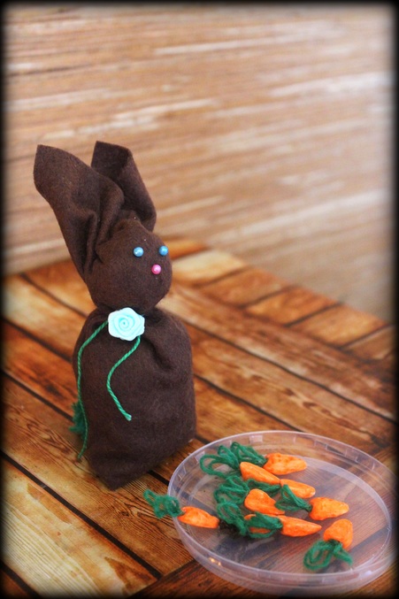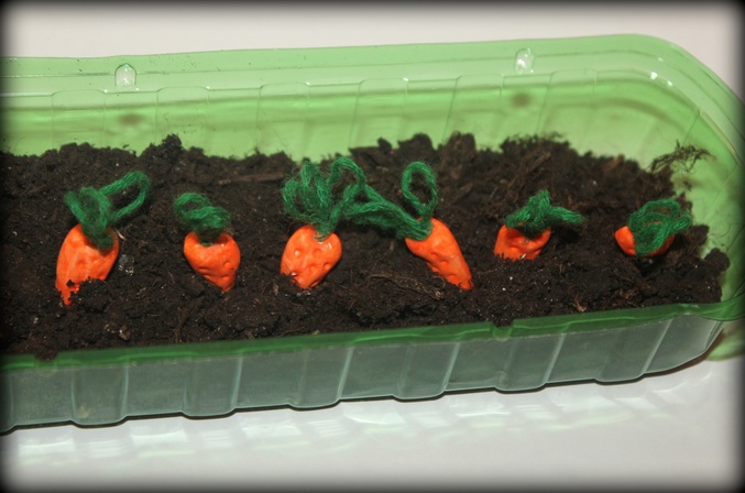 Потом к нам приходил пасхальный зайчик. Для которого мы сажали в настоящую маленькую грядочку морковку (последняя, правда, была не настоящая, её я сделала из холодного фарфора, спасибо девочкам за рецепты).