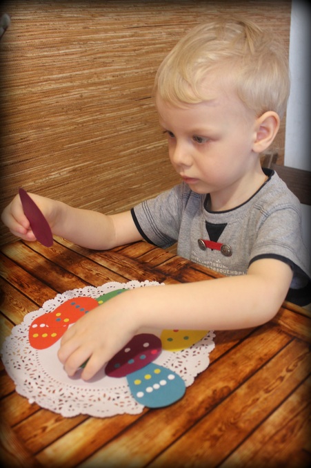 И искали среди целого вороха яичек пары тех, которые были с одинаковым узором. Усложняло дело якобы то, что все они были разных цветов. Что должно было немного запутать ребёнка и заставить его поднапрячь мозг. Но он сделал это задание минуты за полторы. И я даже про себя решила, что вполне могу присвоить себе звание идиотки. Потому что целый час накануне ночью я сидела их делала)))))