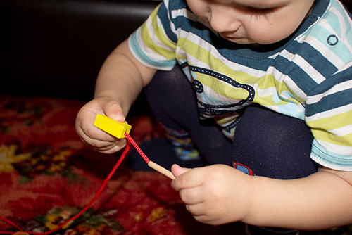 Начали с бус для мамы)) Тёма уже достаточно хорошо нанизывает детальки на шнурочек, но до конца это сделать, не хватает терпения...