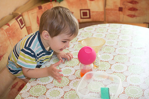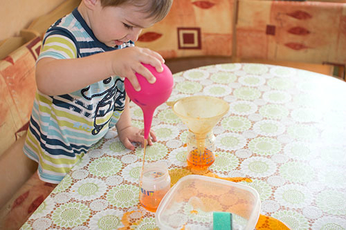 Не смотря на лужи, переливание воды из баночки в баночку получается гораздо ловчее