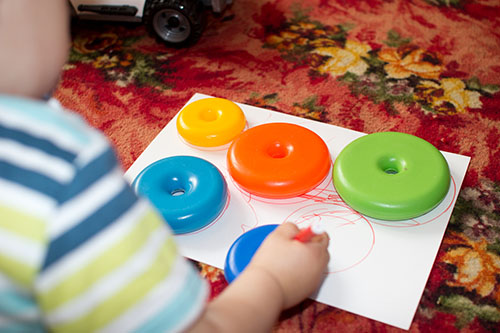Потом пошли обводить колечки от пирамидки и искали какому колечку какой круг принадлежит, Тёмыч забил на это дело и увлекся рисованием