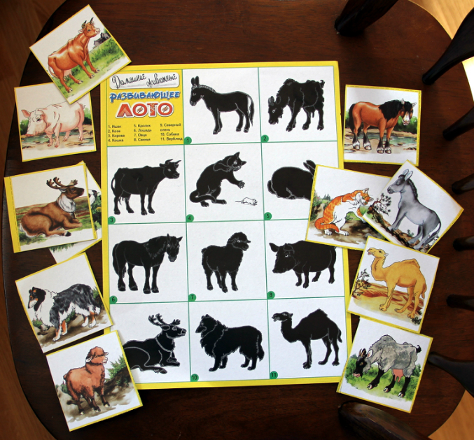 А это лото (ниже) тоже отлично пошло - сыну явно это непросто, но интересно, два раза всех поскладывал с моими подсказками, как искать - он как-то смотрит и не видит, а я объясняла, что надо по очереди перебирать тени и сравнивать. Картон тонковат, надо будет, наверное, наклеить на основу поплотнее. Заодно можно потом сортировать карточки по-всякому, соединять их с фигурками животных, а когда игра совсем надоест, можно разрезать и сделать мемори.