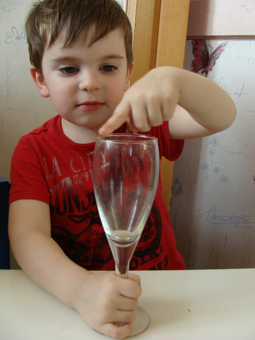 Нужно непрерывно водить мокрым пальцем по краю бокала, и он запоет. Весело, в общем)))) Можно менять количество воды в бокале, звук будет разный, более тонкий и наоборот.