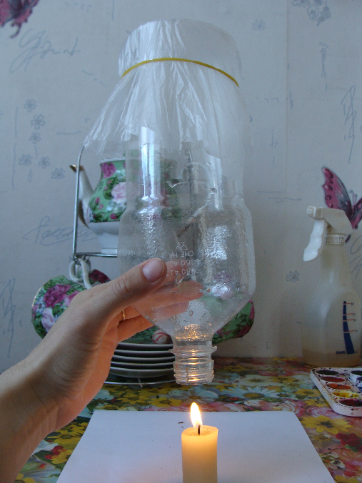 Посмотрим как распространяется звук. Весьма интерсный фокус опыт. У пластиковой бутылки срезаем дно, натягиваем пищевую пленку (у нас пакет), фиксируем резинкой. Держим бутылку над горящей свечой и кончиками пальцев резко шлепаем по натянутой пленке. Свеча погасне т!