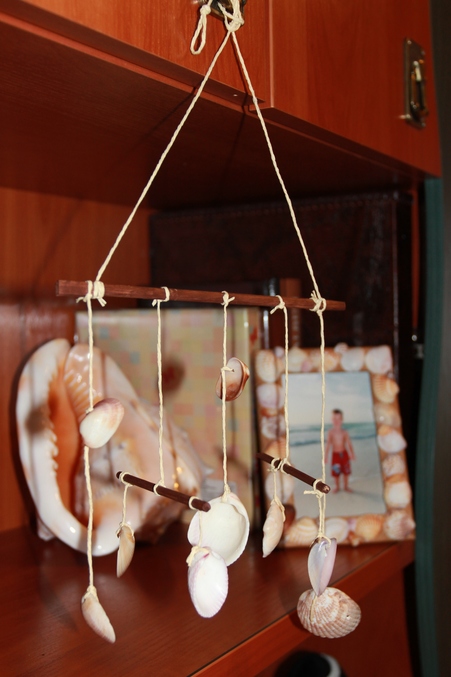 Еще мне очень понравилась мобиль из ракушек, картинку увидела в интернете. Нужны были сосновые палочки, их конечно не оказалось, зато нашлись палочки для суши)) Окрасила их в цвет дерева, акриловой краской. В ракушках нужно было сверлить дырочки - с этим тоже напряженка, но я помнила, еще когда мы были на море и собирали ракушки, в некоторых из них были маленькие отверстия, природного происхождения, я еще удивлялась как они образуются. Перебрали нашу великую кучку ракушек, и нашли таки с дырочками, ну а дальше оставалось только собрать: