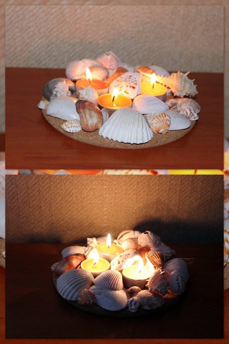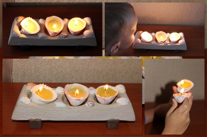 на старую деревянную дощечку выложили и наклеили ракушки и одноразовые свечи.