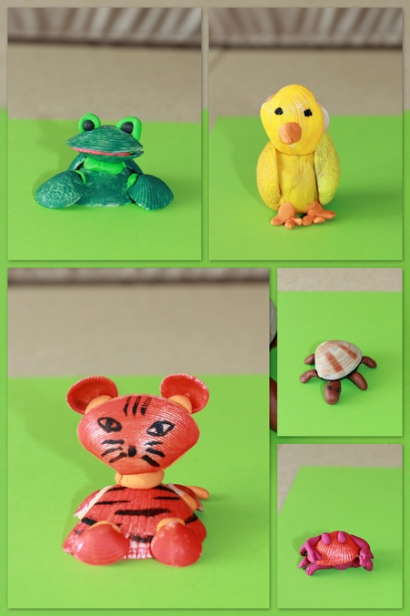 Артём очень увлекся процессом, с большим удовольствием красил ракушки, потом соединял детальки-ракушки пластилином, любимцем стал тигрёнок))