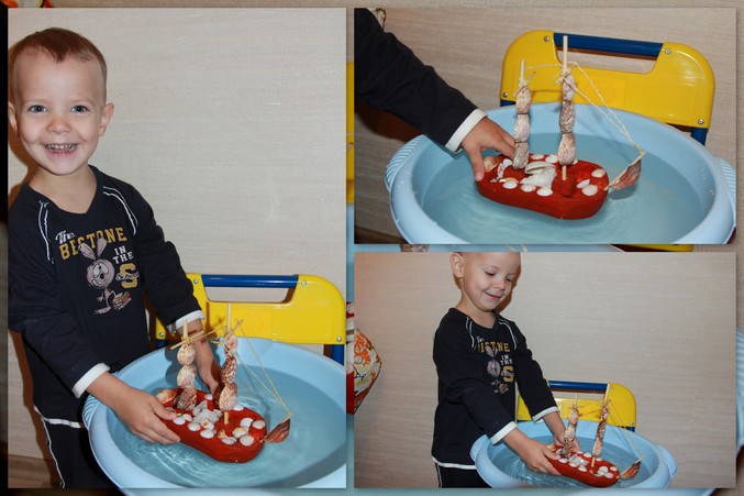 Лодка из пенопласта, вырезала из пенопластовой упаковки от мультиварки, зашкурила ее наждачной бумагой, покрасила и установила мачты. Наш парусник совсем не боится воды, мы даже опробовали чуть-чуть.