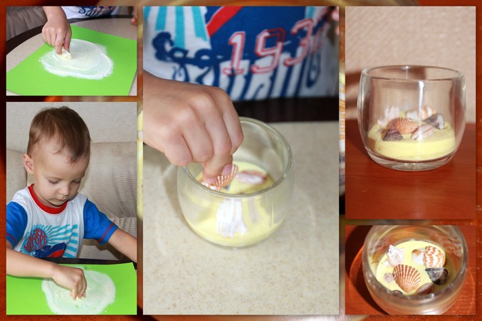 Песка дома не оказалось, поэтому песок сделали сами))) Взяла обычную соль, высыпала ее на лист бумаги, вручила сыну желтый мелок для рисования, и соль очень быстро приняла нужный цвет. Высыпали соль-песок в маленький стаканчик и украсили ракушками, получилась морская такая композиция: