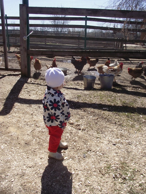 Но в неописуемый восторг мою козявку привели только куры и петухи))) Подбегала по пять раз с их клетке, уходить не хотела. А когда петух кукарекал, счастью не было предела))
