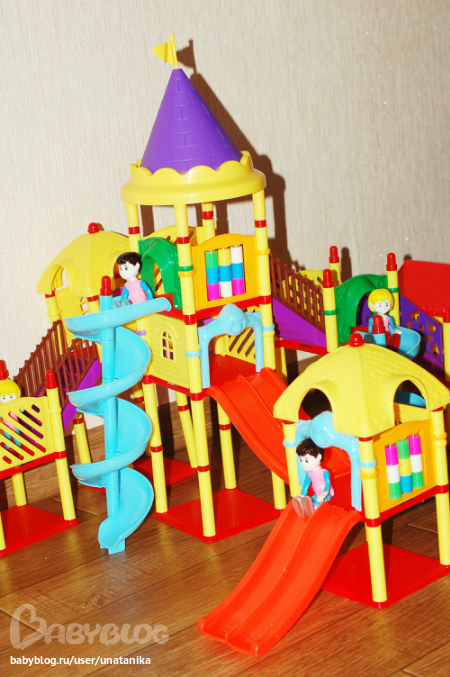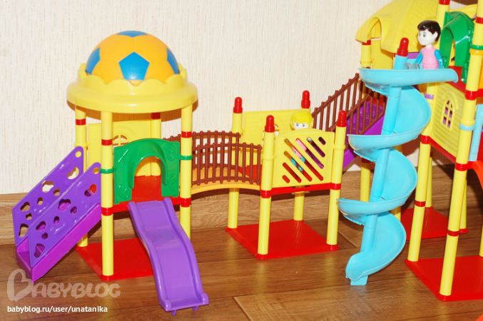 Детали яркие, сделаны качественно, без запаха. Единственное, огорчили человечки - они слишком большие для этой детской площадки. Но сами по себе человечки очень хорошие и их можно использовать для других игр (ручки и ножки двигаются). А на горах у нас катаются детки из наборов Playmobil и подходящие по размеру игрушки из киндеров.
