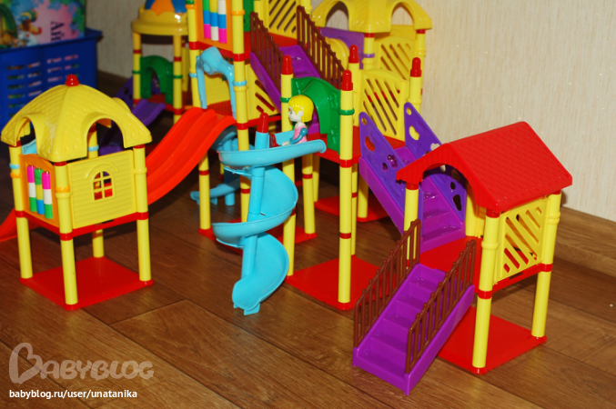 Пока решила убрать часть конструкции, т.к. все же у трехлеток еще не совсем развита моторика и сложно продвигать человечков по многочисленным домикам. И конечно, данное сооружение занимает очень приличное место в комнате:).