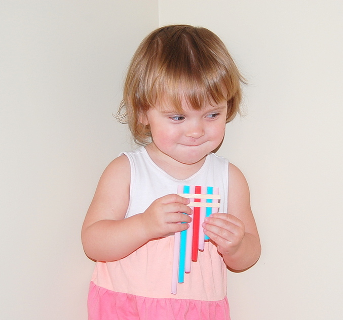 Делается очень просто, а сколько радости у детей. Нарезала соломинки разной длины (с разницей 1-1,5см), с одной стороны скрепила скотчем, с другой прикрепила (двухсторонним скотчем) две плоские палочки для жесткости. Нижние отверстия у трубочек залепили пластилином – девчонки помогли. Флейта играет не хуже, чем настоящая! Дочери, конечно, не такие лихие музыканты, как их мама. Правда, у мамы ни слуха, ни голоса, но зато с душой к делу подходит:))