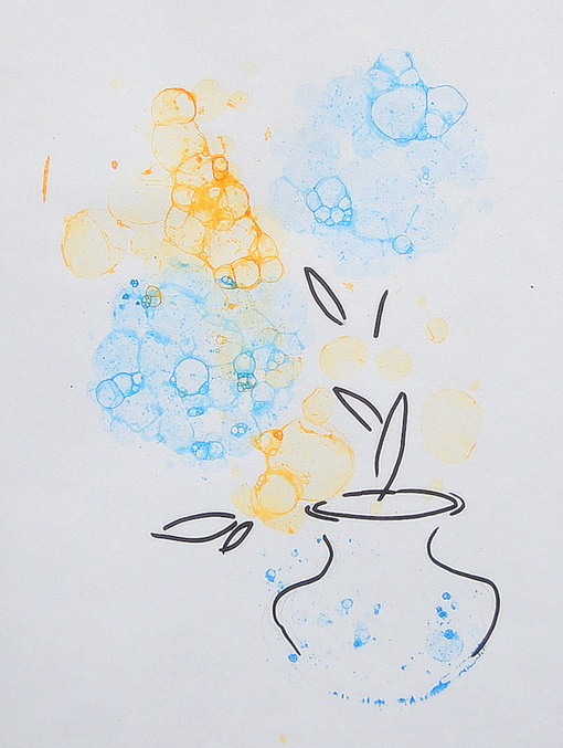 Итак, первый способ: обмакивать трубочку в раствор и выдувать пузыри над бумагой. Сначала я держала трубочку, а дети по очереди дули. Затем принялись за дело сами, оторвались по полной... В последствии, я дорисовала черным маркером сюжет к их произведениям. Вот что получилось - это из раннего (когда я держала трубочку):