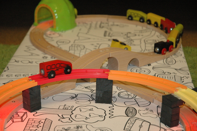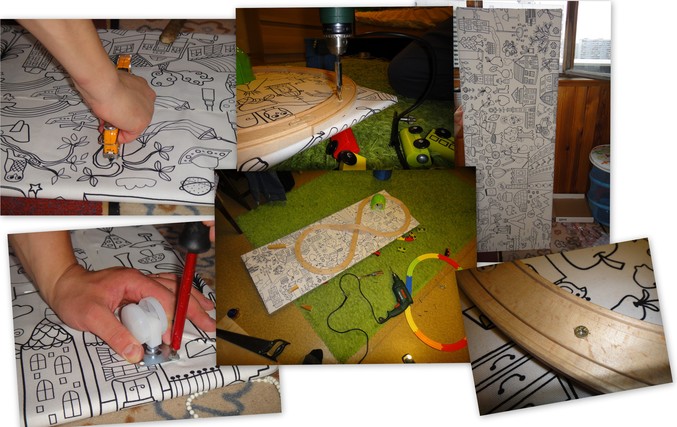 Сама идея проста - берется лист фанеры, обшивается красивой детской тканью (я свою купила там же, на ней детский черно-белый рисунок, который можно раскрасить текстильными фломастерами. Далее надо приделать колесики (мы их тоже купили в ИКЕА). Ну и собственно дальше к фанере прикручиваются сами детальки железной дороги.