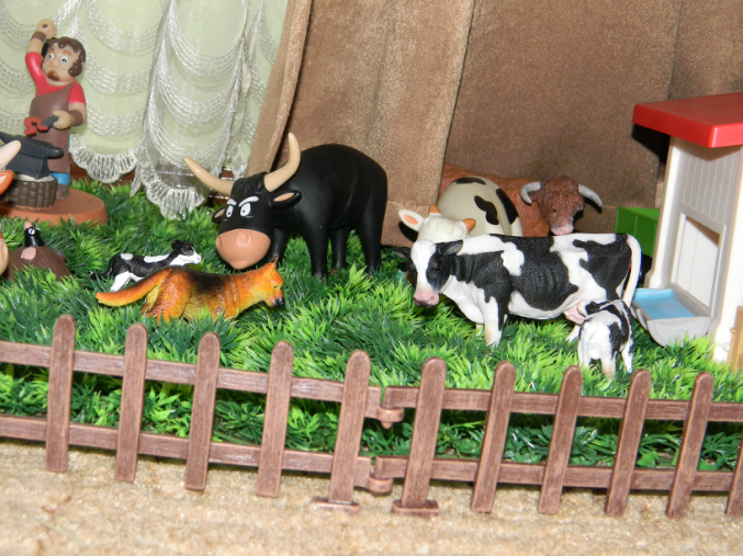 на ферме у нас живут и и из деагостини , в состав этой входят и трактор и есть там животные (но меньше наших) и люди есть и инвентарь (грабли, вилы, ведро, бидон и т.д.) , трава и пугало куплены в фикс прайсе. Большая ферма