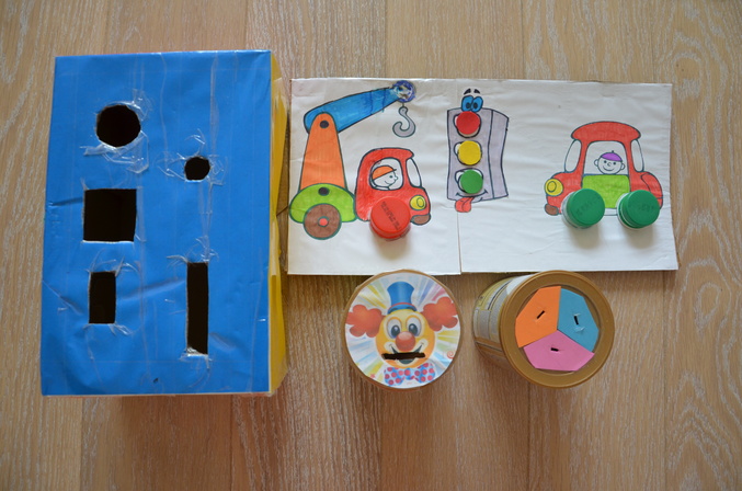 В дырочки большого сортера суем: яички от киндер-сюрпризов, бигуди, детали конструктора Томик, крышечки от пюре, колечки пирамидок.