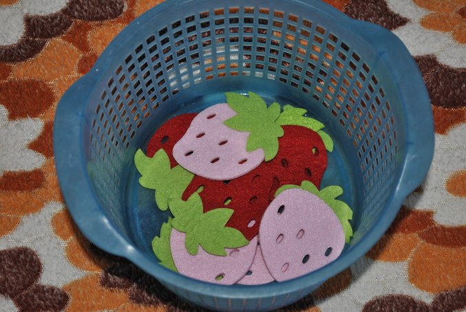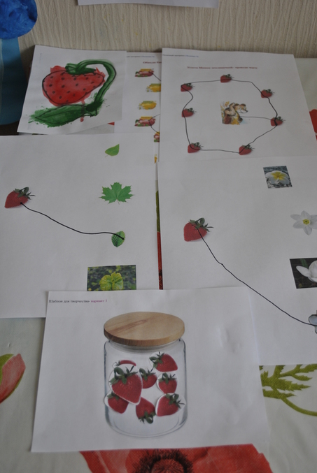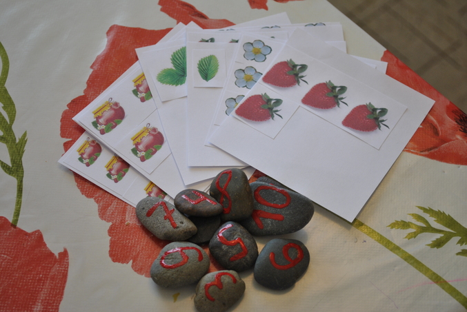 2) Затем собирали ягоды ( игра на внимательность, я спрятала земляники в комнате, а сын искал, посчтила сколько нашли). Карточки на счет (это уже моя задумка, надо было усложнить занятие, карточки со счетом до 10 и соответственно камни с числами. Каждый камушек на свою карточку)