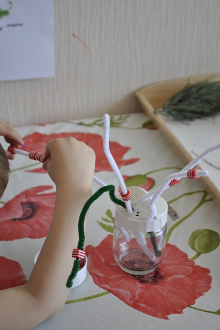 3) Сделали печатные занятия, также все готовое в комплекте.Одевали бусинки на пушистую проволку (это типо ягодки). Еще раскрашивали, делали аппликацию)