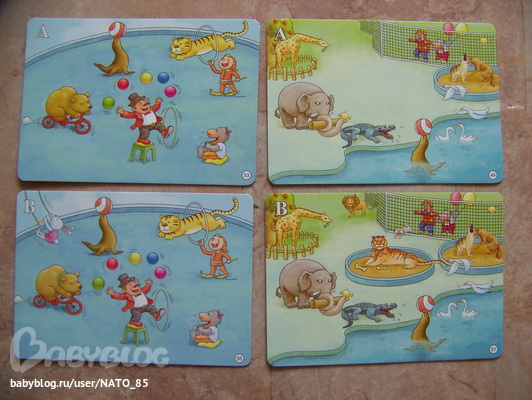 1. Выбираем 2 карточки с одним сюжетом и в течение обозначенного времени ищем отличия (обычно их 3, но на некоторых и меньше). И почему-то производитель не посчитал нужным нигде указать точное количество или сделать карточку с ответами, чтобы ребенок мог сам себя проверить...
