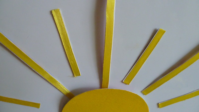 Солнышко и тучка вырезаны из картона. Дождик и лучики - атласные ленты приклеены на картон. Чтобы все это держалось - на обратной стороне на каждую деталь приклеила двусторонний скотч. А держится все это у нас на мольберте - сторона для маркера. В планах еще сделать травку и цветочек. И тут вариаций игры очень много: сначала дала дочке лучики и она их клеикла к солнышку, потом "Дождик", потом все перемешивается и ребенок сам должен создать правильную картинку. Когда будут еще травка и цветок - тут уже и запоминание основных цветов (для нас уже закрепление проденного)