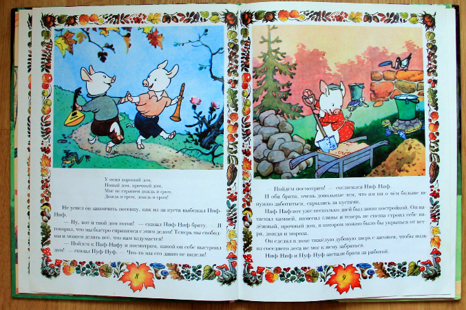 2. С.Михалков. Три поросёнка. У нас книжка по наследству с иллюстрациями Ротова - у меня такие же были в детстве, помню, как любила рассматривать строительство дома Наф-Нафа. И ещё у меня была из сейчас изданных. Пользуется большой популярностью, на её основе весело играть и дома, и на улице. А ещё Фелька жалеет несчастного волка и отправляет его к Айболиту лечиться :)))