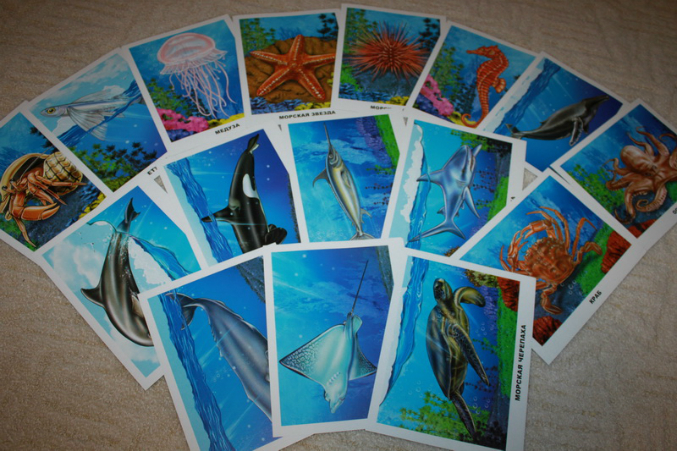 "Уроки для самых маленьких" - обычный картон, причем в только что купленном наборе картинки хочется чем-нибудь протереть, кажется, будто между ними песчинки, картинка - рисованная, но в приципе реалистичная. Мне, например, во многих наборах не нравится фон, он какой-то искусственный - зеленая трава и небо с облаками. У морских обитателей как-то поспокойнее в этом плане. Никакого текста с обратной стороны нет.