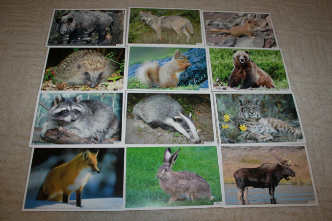 Карточки разного размера: "Мир на ладошке" - 13*20 см, остальные - побольше. Упаковка у всех тоже разная. В "Уроках..." карточки могут высыпаться. На всех карточках в уголках картинки есть подпись животного (ну или того, что изображено, т.к. есть наборы с насекомыми, транспортом и пр.).