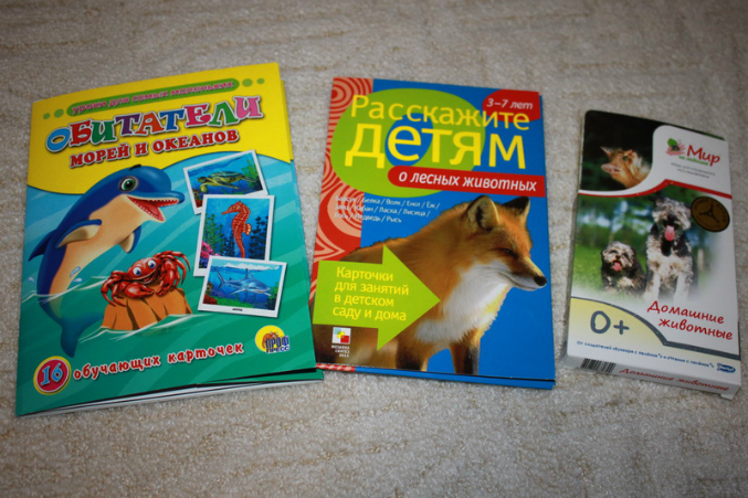 там темы разные есть. И животный разных стран и т.д. у нас таких наборов штук 8 точно есть. Сначала просто пользовались, потом разрезали и учили слова, написание. Не дорогие. а самые первые и самые любимые были такие карточки украинского производства, очень классные, Плюша по ним занималась с 8 месяцев, к году она безошибочно их все называла. Там несколько основных групп слов - птицы, животные, предметы и т.д.