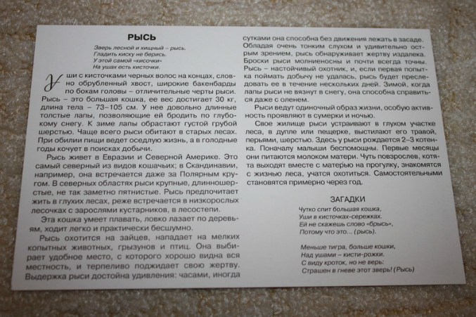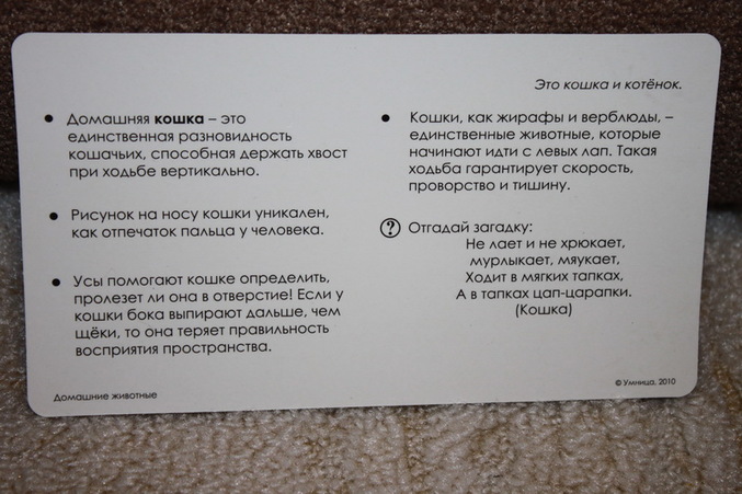 "Расскажите детям" - гладкий картон, текста значительно больше, чем у "Умницы", но карточки и заявлены на возраст 3-7 лет, а не с рождения. Родителям, у кого дети помладше, нужно сначала прочитать текст и потом выборочно отдельные моменты озвучить ребенку. Загадка тоже есть. Картинка - тоже фотография, как у Умницы.
