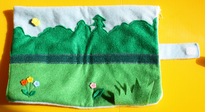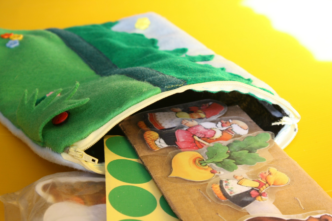 А сбоку - молния. В получившемся большом кармашке у нас лежит картонка с героями сказок, наклейки, картонные паззлы. Можно и карандаши положить, и бумагу - в общем, всё что понадобится вам в поездке!