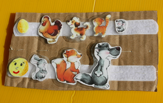 А на липучку крепятся герои сказок. В идеале, конечно, из фетра. Но я просто распечатала картинки и заламинировала. Пока у меня три сказки - "Репка", "Курочка Ряба" и "Колобок".