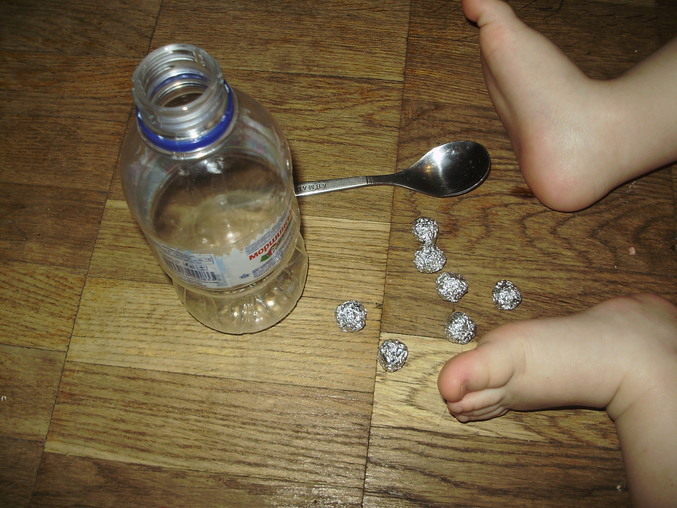 А в этой игре совсем ничего особенного, известная всем "моторика" в нашем исполнении))). Но идея, опять же, пришла внезапно (после поедания конфет в фольге), а Ванюшке очень понравилось. Сначала так тягал шарики ,потом мы достали бутылочку и ложечку. С удовольствием играл.