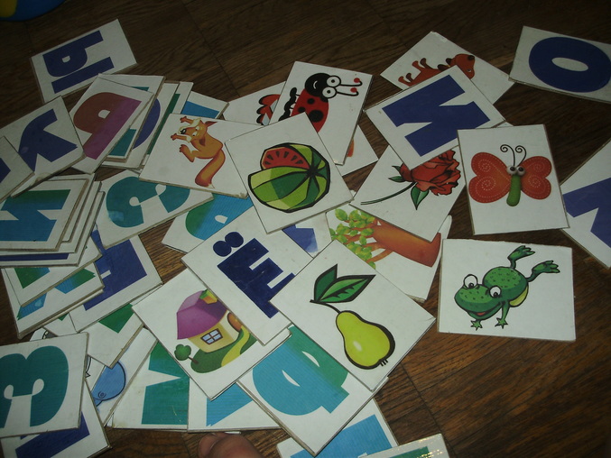 Сделан мною месяцев в восемь Ванькиных, имел бешенный успех с тех пор и до последнег овремени. Нет, буквы мы по нему не учили и не учим, хоть я и озвучиваю. Это у нас чисто развлекалка и ничего более. Малыш тягал коробку практически каждый день. Высыпал, рассматривал, тыкал пальчиками, носил по квартире, складывал обратно. В общем, радовался, как мог. Она его всегда приводила в восторг, хоть и была в свободном доступе. Картинки выбирала и обрабатывала сама, распечатывала и наклеивала на очень плотный картон. С одной стороны буква, а с другой - картинка. Каждой буквы по паре)). Обклеивала скотчем.