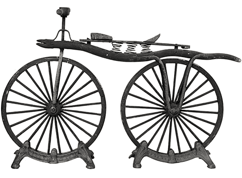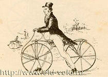 Пошуршав в интернете, я нашла картинку того самого первобытного велосипеда. Вот он Беговая машина Карла фон Дреза 1817год (патент на изобретение получен в Германии).