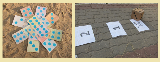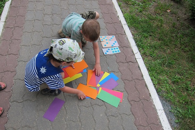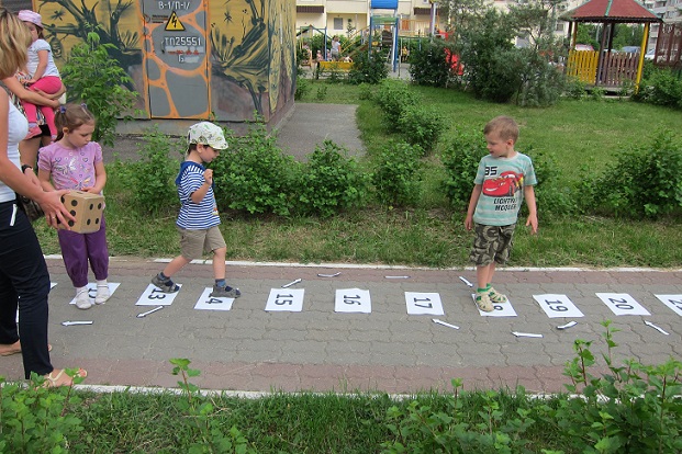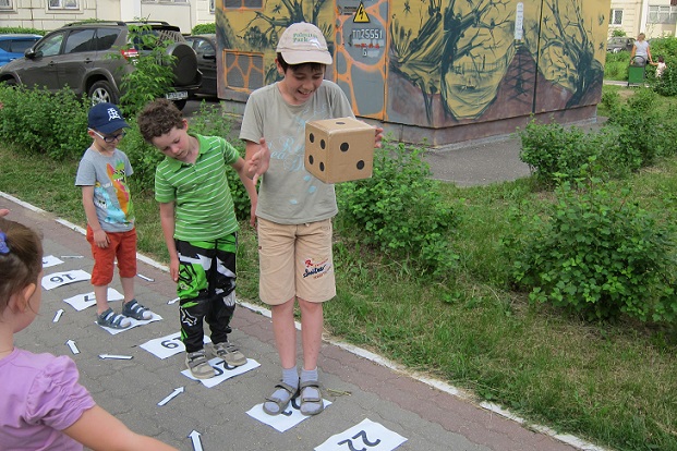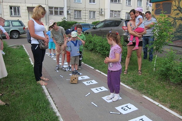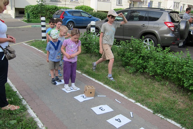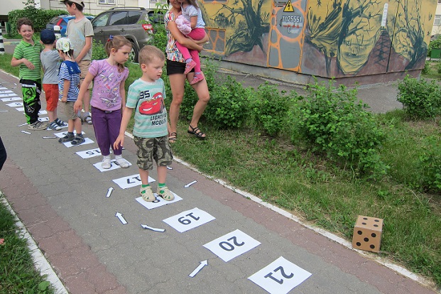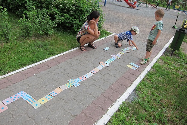 Подвижные игры и спорт ( зарядка, игры на улице и в в воде, танцы, игры с мячом и.т.д.)У нас во дворе отличная детская площадка. Один только минус - нет на ней стола. А так хочется поиграть с детьми в настольные игры! Но нам все ни по чем! Настольные игры мы быстро превратили в напольные, немного увеличив их масштаб. Вчера мы играли в домино и ходилку. Интересно? Прошу под кат.