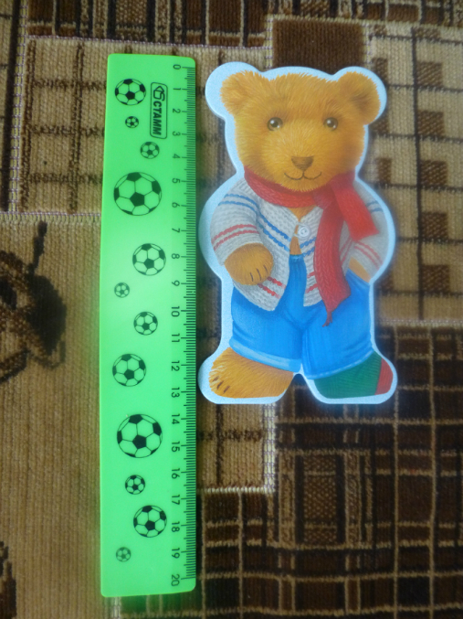 Размер мишки, качество картона очень хорошее,не согнуть..