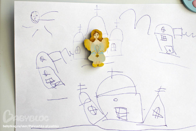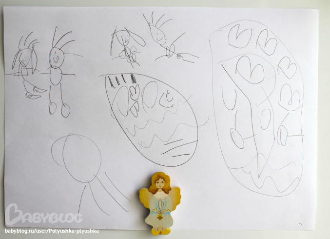Порисовали на заданную тему - Пасха. Храм под ангелом рисовал папа, все остальное - Плюша. По-моему, у нее получилось очень неплохо!