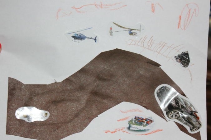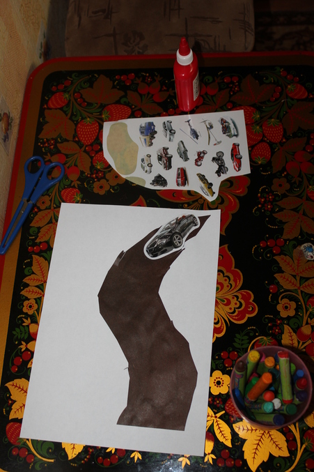 2. Из листа коричневой цветной бумаги вырезаем дорогу (я нарисовала контур и помогала держать лист), приклеиваем дорогу на белый лист. По дороге пускаем машины ("