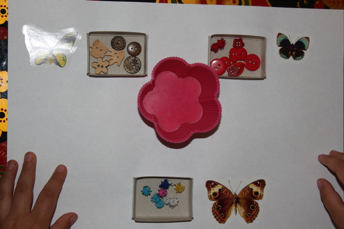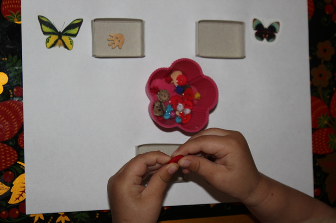 Предыстория: "Три подружки-бабочки нашли на большом цветке сокровища и решили разделить их между собой. Одна сказала: "Я возьму только деревянные", другая сказала: "Я возьму только красные", а третья сказала: "Я возьму только помпончики". Пересекающиеся классы здесь: среди помпонов есть 2 красных. Т.е. их может взять и вторая, и третья бабочки. К моему удивлению, у Катюшки проблем вообще не возникло, а все потому, что она сразу принялась раскладывать системно: сначала отобрала все деревянные пуговицы в первую коробочку, потом все красные пуговицы и 2 красных помпона в коробку второй бабочки, и третьей остались одни помпоны.