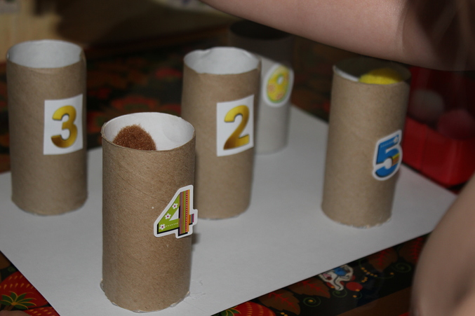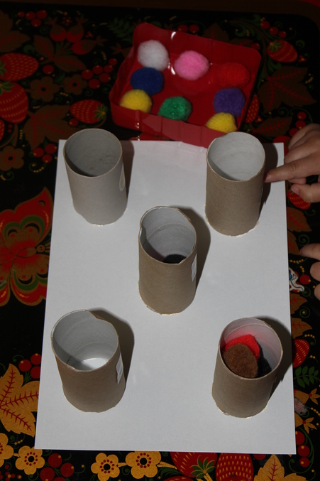 1. Разложить помпоны по тубусам. На каждом тубусе приклеена цифра, соответственно, столько помпонов нужно положить сюда. Условие: в каждом тубусе все помпоны должны быть разноцветными.