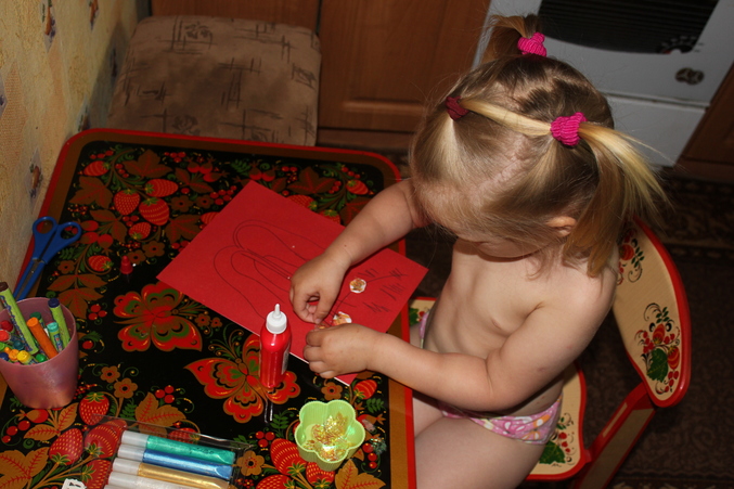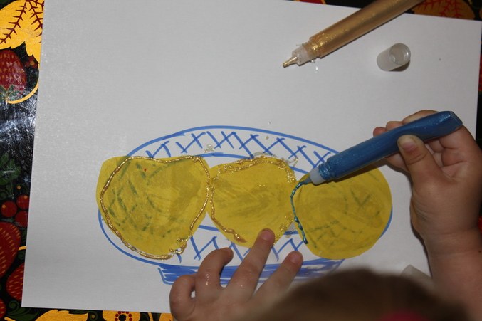 Вырезанные шаблоны яблоков приклеиваем на "блюдце", Катейка обводила по контуру блестящими гелевыми карандашами.
